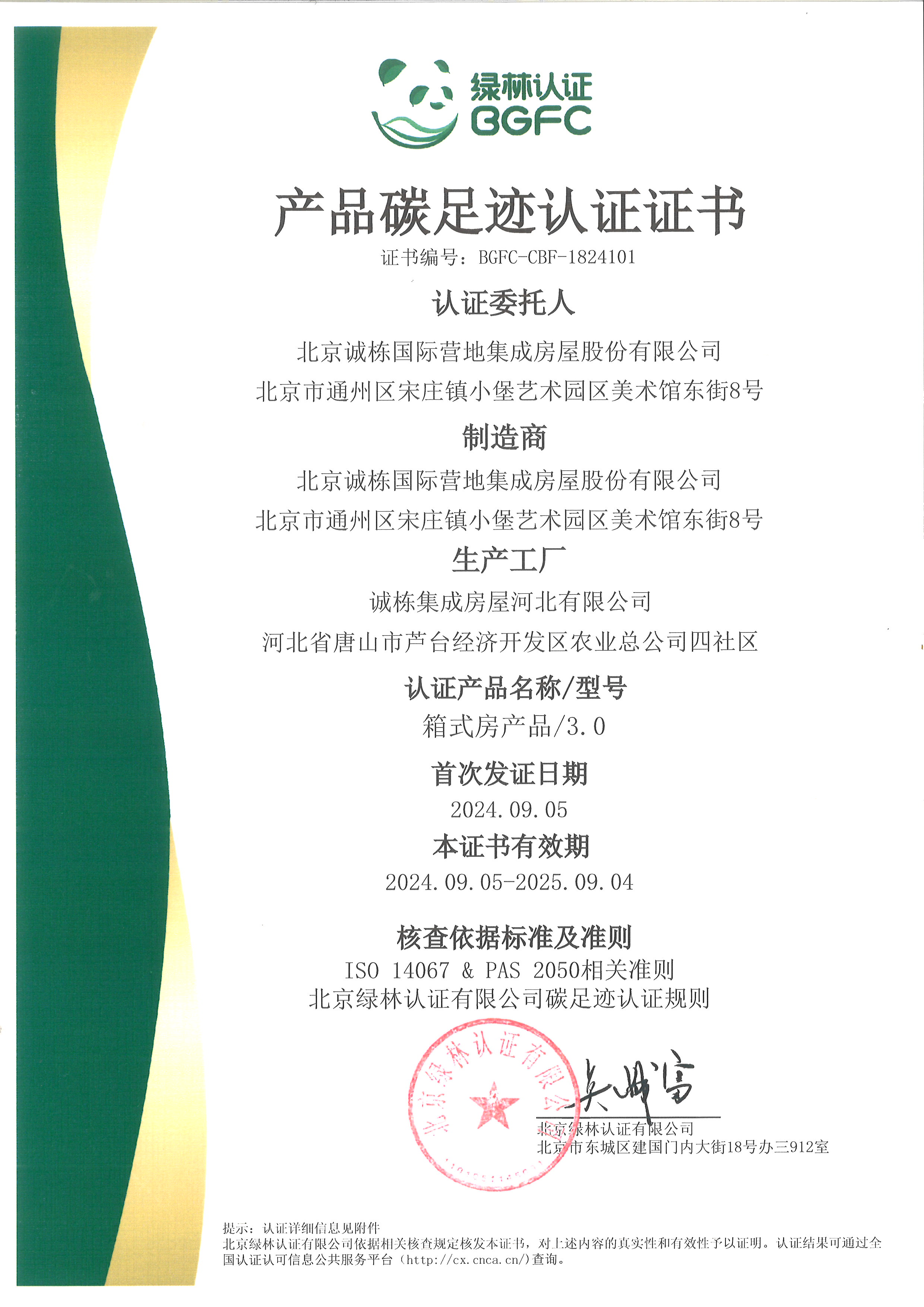 2024 年 9 月5日,北京诚栋国际营地集成房屋股份有限公司所生产的箱式房产品成功获得北京绿林认证有限公司颁发的产品碳足迹认证证书。